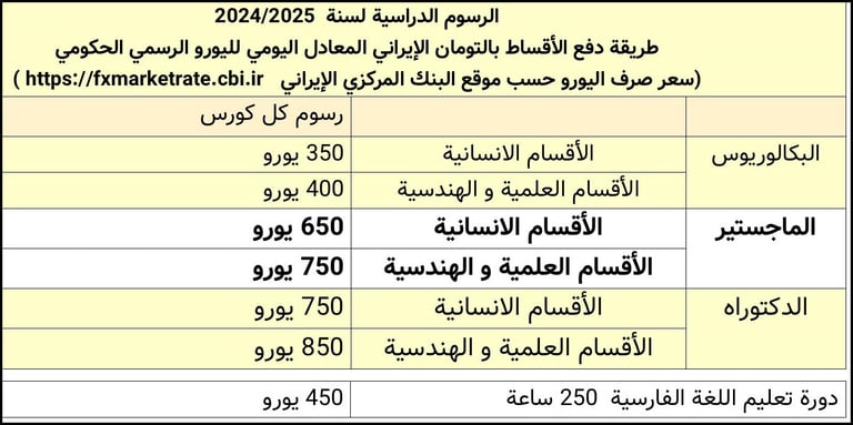 طريقة دفع الأقساط بالتومان الإيراني المعادل اليومي لليورو الرسمي الحكومي